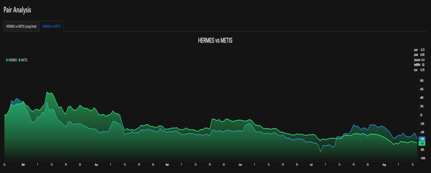 Analyze real time correlation between long and short assets, as well as current and historical APR trends, for better decision making.